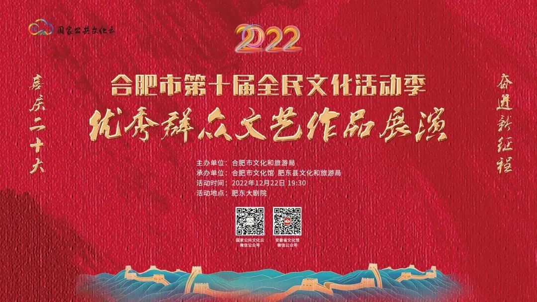 以多彩的文化歌颂新时代,用优秀的作品展现新风貌。12月22日,“喜庆二十大 奋进新征程”合肥市第十届全民文化活动季优秀群众文艺作品展演即将在肥东大剧院举办,国家公共文化云将为您全程直播,精彩不容错过!