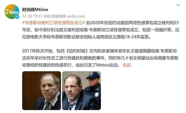 银幕之外,今年12月20日,洛杉矶法庭判定韦恩斯坦三项性侵罪名成立。