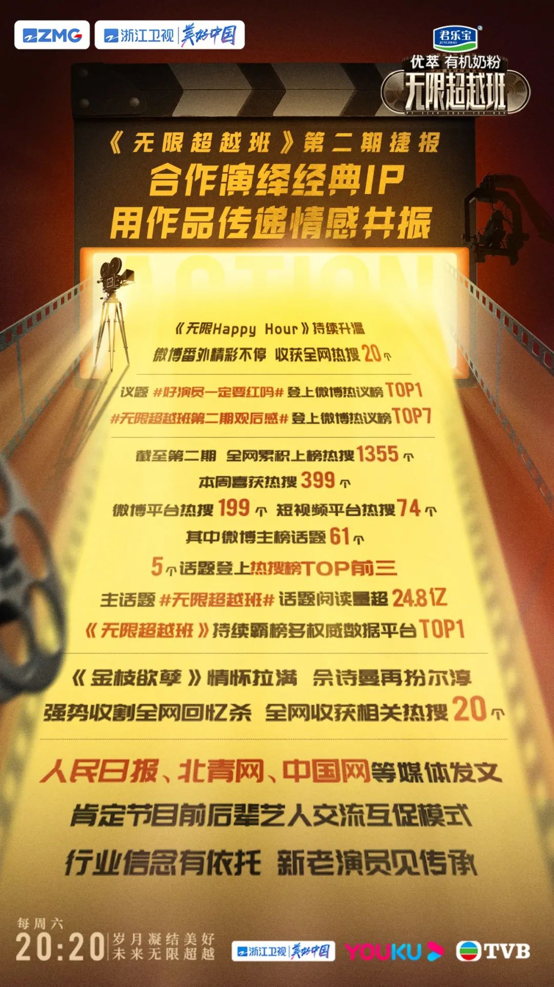 节目一经播出,强势收割全网回忆杀。截至第二期,全网累积上榜热搜1355个,本周喜获热搜399个,其中,微博平台热搜199个,主榜话题61个;短视频平台热搜74个。节目微博主话题#无限超越班#阅读量已超24.8亿,#好演员一定要红吗#登议题榜TOP1,引发全民热议。