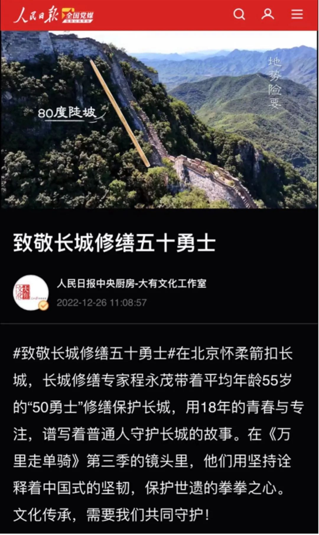 走进北京怀柔长城、讲述“修长城”的故事,12月25日,由浙江卫视、国闻文化、腾讯视频联合出品、酒鬼酒冠名播出的《万里走单骑—遗产里的中国》第三季第二集播出。由中国文物学会会长单霁翔带领的“万里少年团”成员周韵、唐九洲和飞行嘉宾王濛,走进北京怀柔长城,体验长城修缮保护,聆听长城保护者的故事,体悟长城与时俱进的精神内涵。本期节目上线当晚,基于节目内容生发的议题讨论#你愿意接受一成不变的工作吗# 跃上微博热搜榜第23位,热聊榜第8位,视频热议榜第4位,该话题也登上微博热议话题榜第3位,充分体现了观众对于节目内容的高度关注。网友们纷纷表示:“中国本身就是地大物博之地,很开心有人能够一点点去让更多人知道中国之大,中国之奇,中国之美。让文化类的综艺多起来吧。”