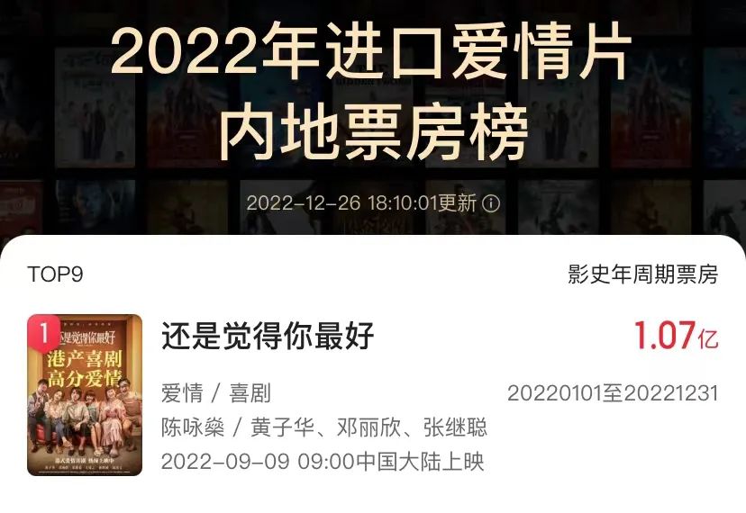 该片在中秋档上映,从首日票房第四到第五天逆袭至第二,且连续7天上座率日冠,最终以1.07亿累计票房夺得今年进口爱情片内地票房冠军。
