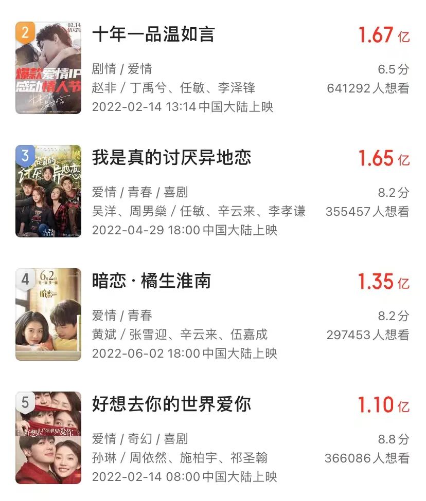 据1905电影网数据统计,截至发稿时间,2022年票房过千万的国产爱情片达17部,其中有12部都是专供年轻情侣向的青春爱情片。而在7部票房过亿的片子里,有4部也都是青春爱情片,包含《十年一品温如言》《我是真的讨厌异地恋》《暗恋·橘生淮南》《好想去你的世界爱你》,《想见你》也将很快加入其中。
