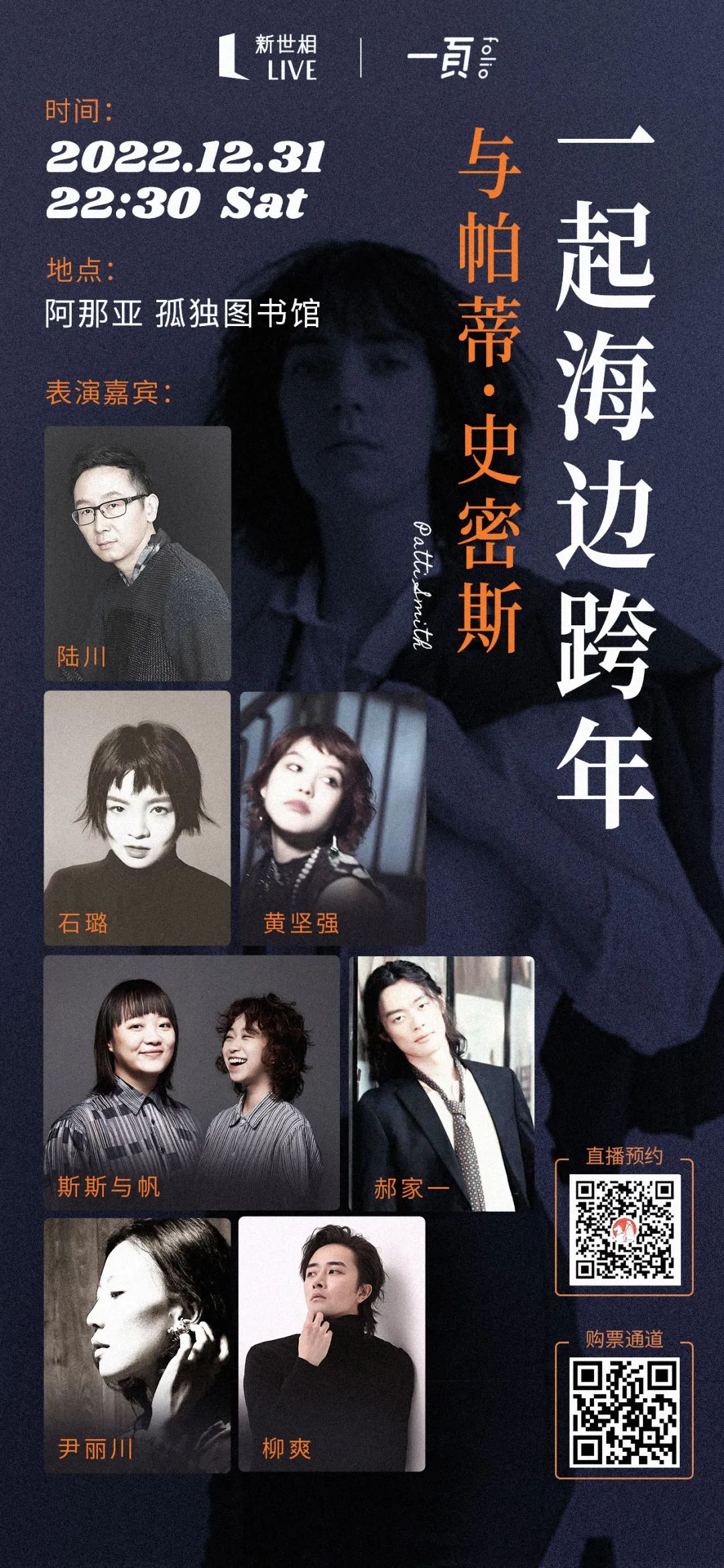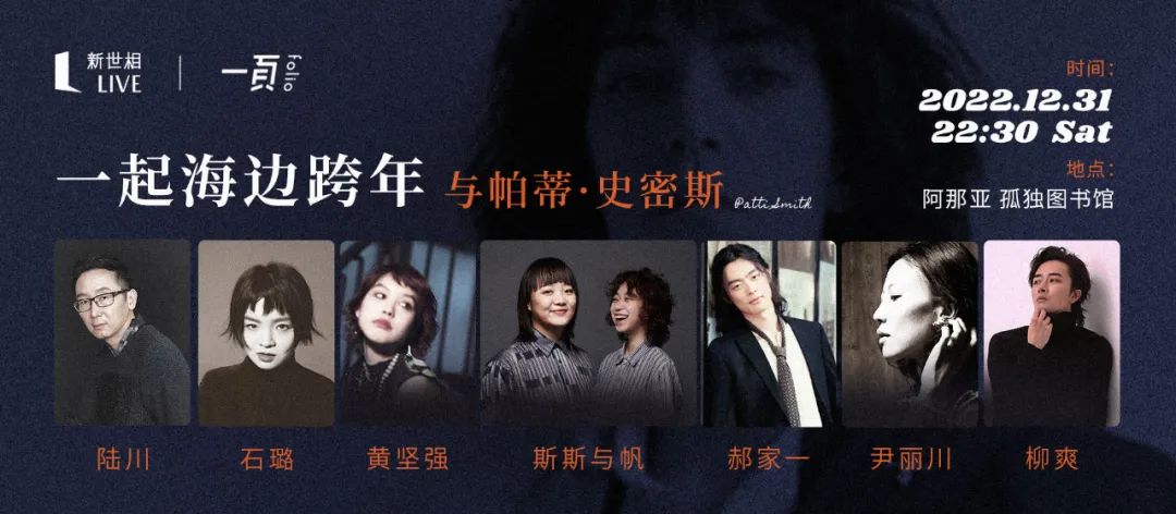 帕蒂·史密斯对于很多人来说都是一个具有强烈吸引力的传奇偶像。跨年夜,在她的影响下,我们汇聚了影视、音乐、文学、戏剧等不同领域的艺术家,参与现场朗读、表演和互动。