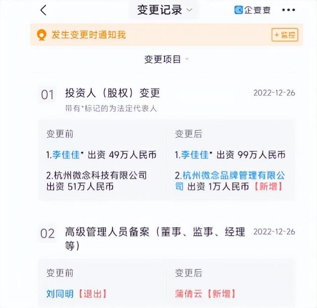 记者注意到,在今日(2022年12月27日)微念发布和解公告前,双方的股权关系就已提前做好了变更。据国家企业信用信息公示系统,12月26日,子柒文化新增3项变更信息,其中1项是投资人(股权):“李佳佳出资49万人民币;杭州微念科技有限公司出资51万人民币变更为“李佳佳出资99万人民币;杭州微念品牌管理有限公司出资1万人民币”。