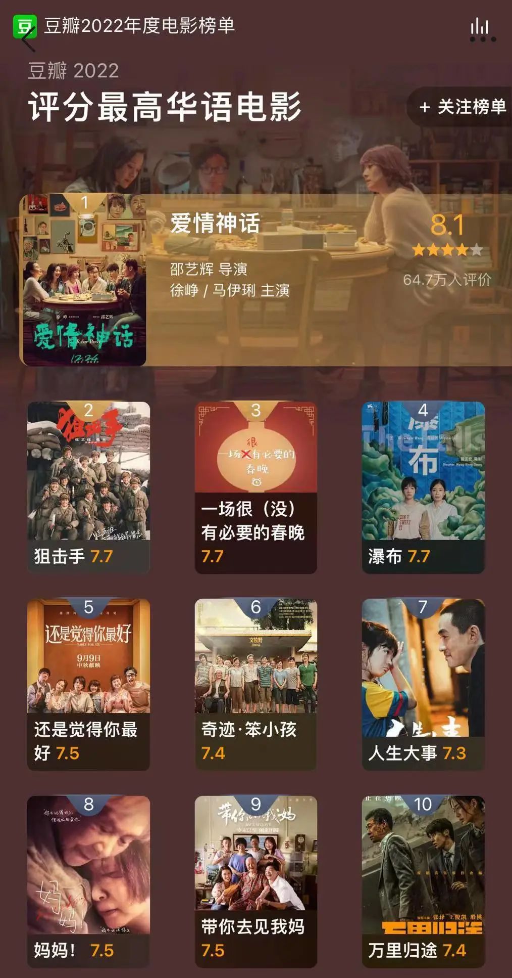 就好像排名第一的《爱情神话》,我也很喜欢,去年大家都聊过很多次,这也是我觉得最该进的榜单的一部。