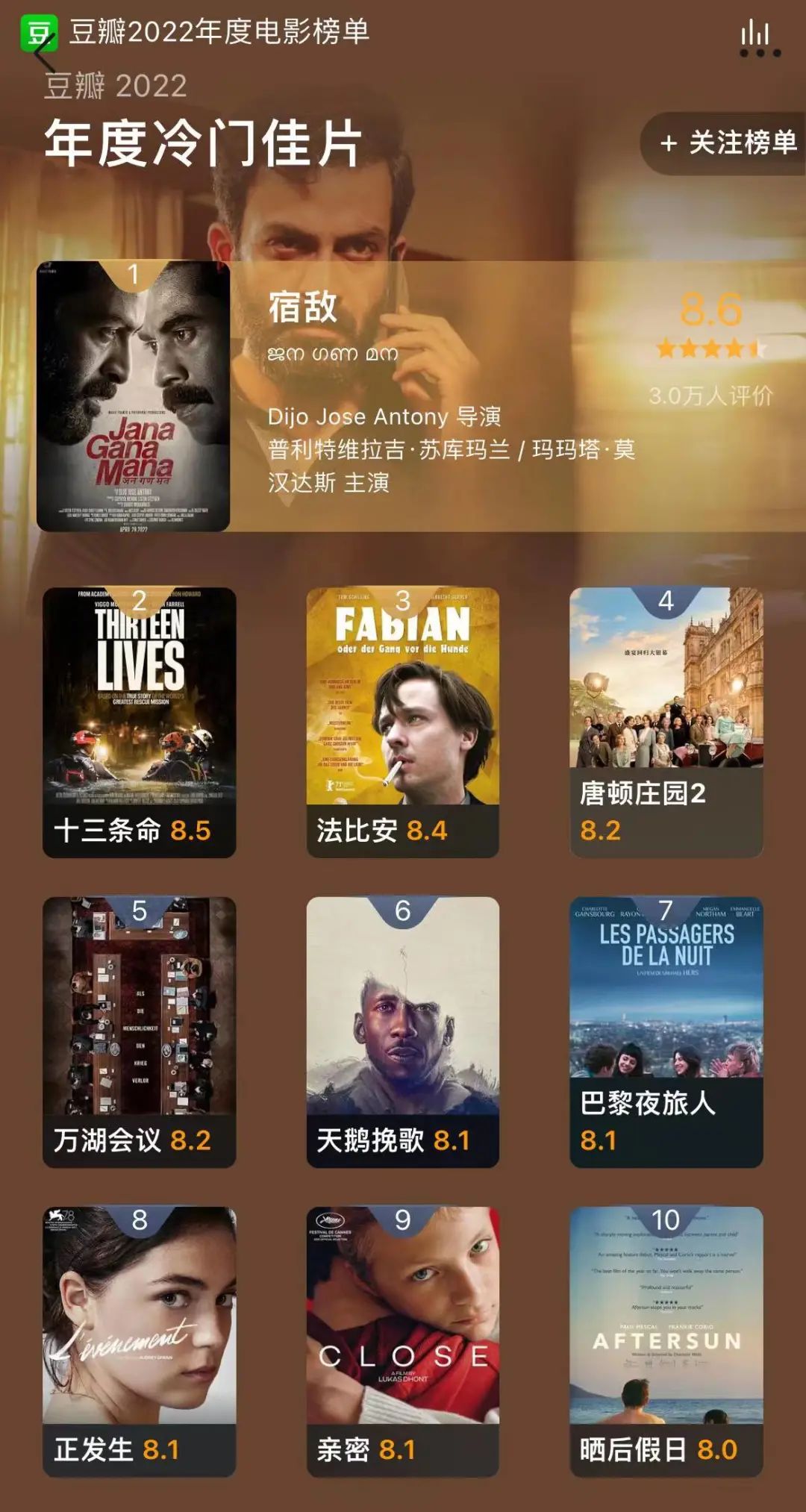 冷门佳片榜单一直是豆瓣年度榜单的特色,它在于帮助大家发现一些观看人数没那么高,或者是相对小众的好电影。