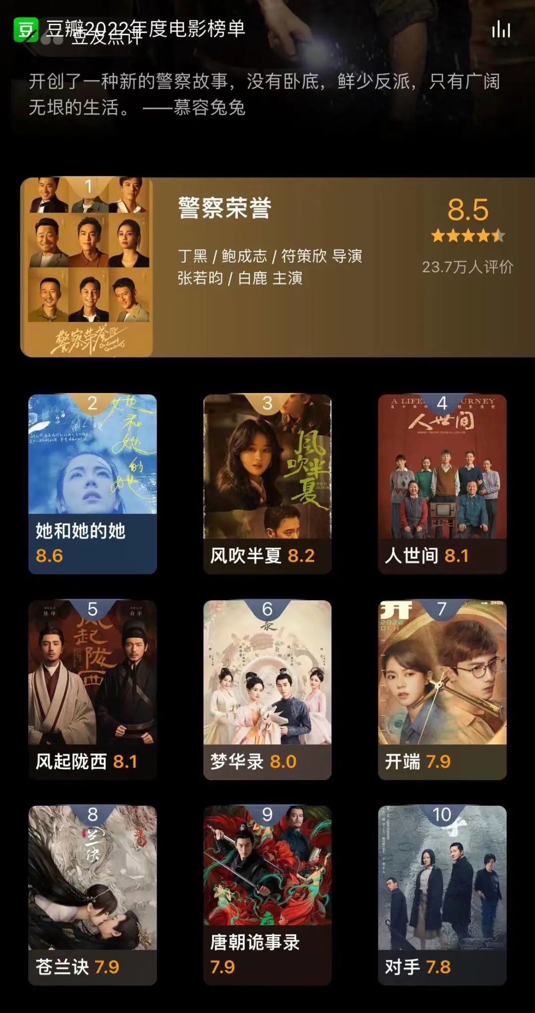 每年年末呢,豆瓣电影都会整理一个年度电影榜单,汇总这一年评分最高的各种电影、剧集、综艺什么的。
