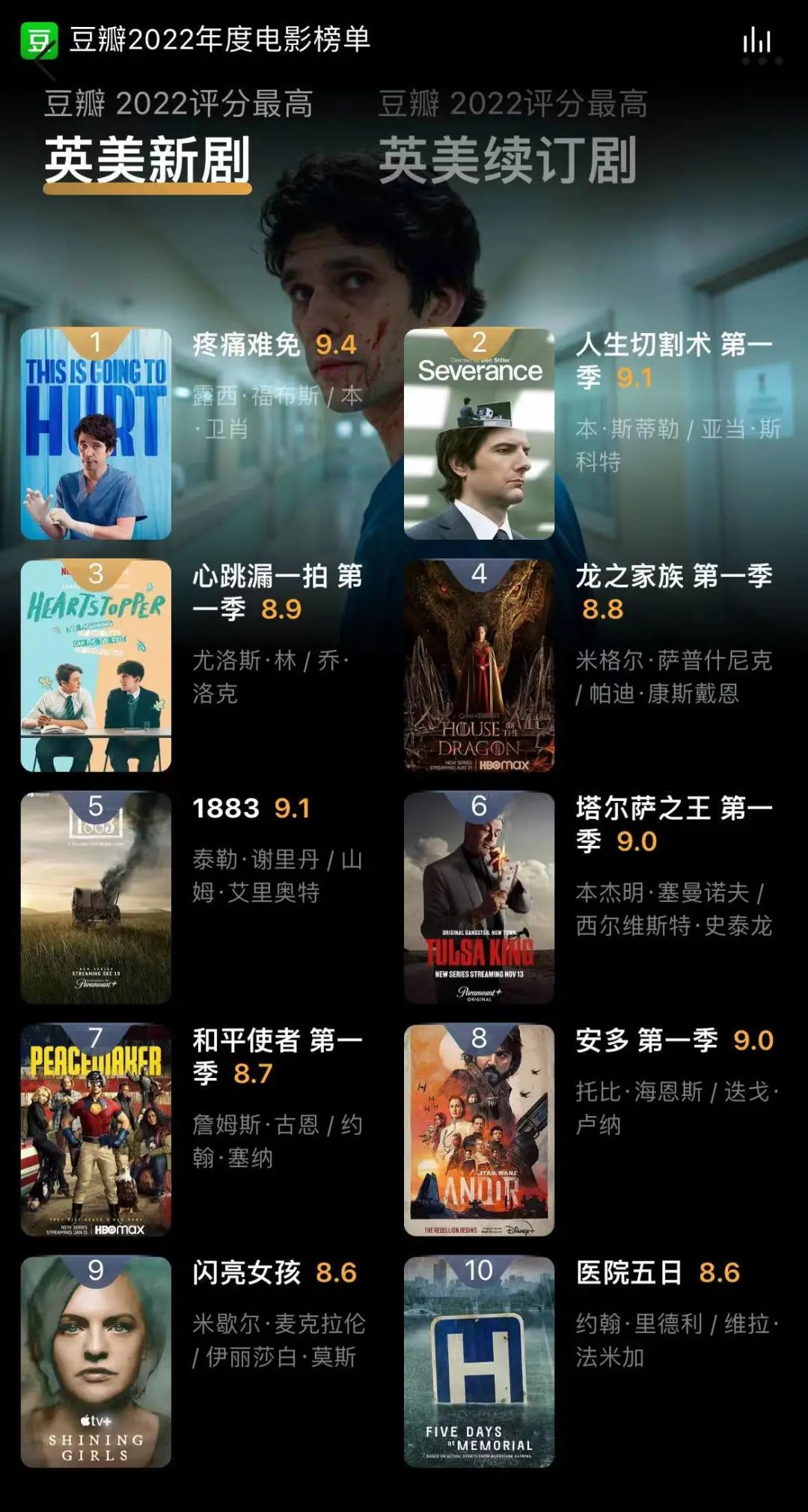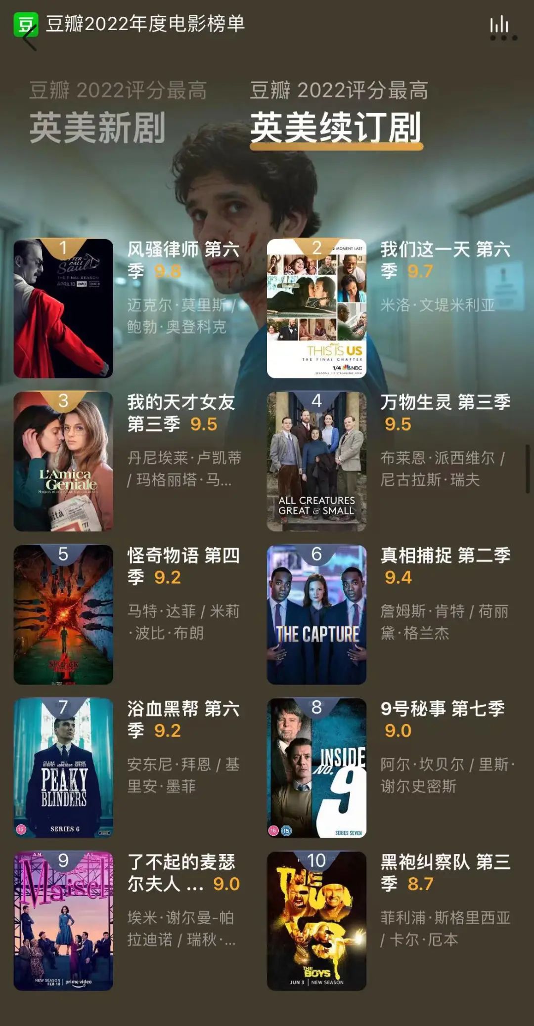 这个榜单倒是很热闹,基本这一年高分新剧都在了,而且,其中多部我们之前也都推荐过。