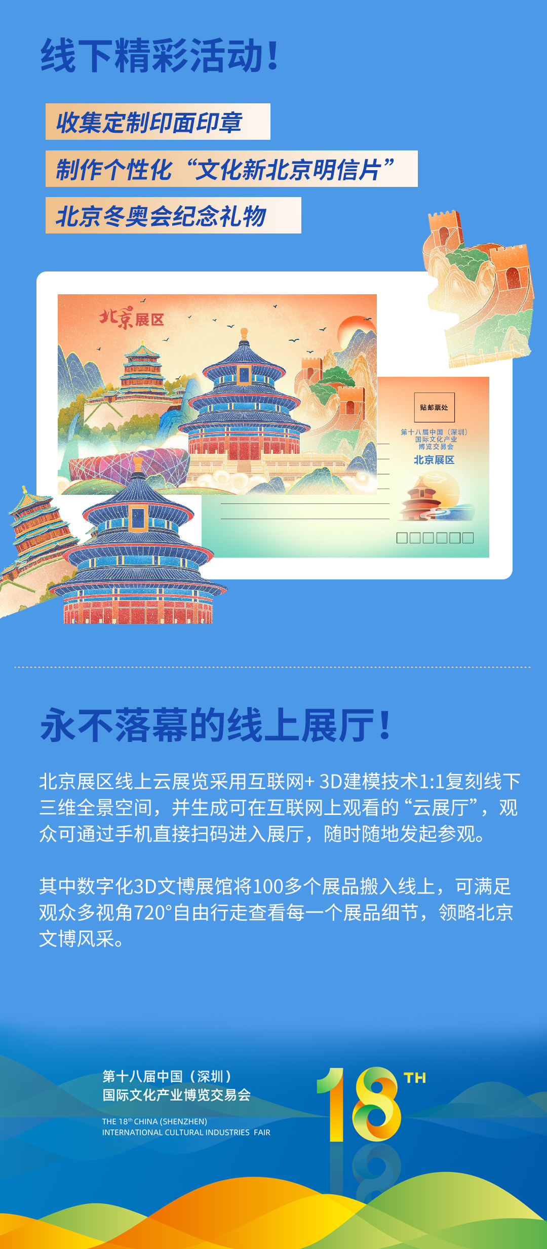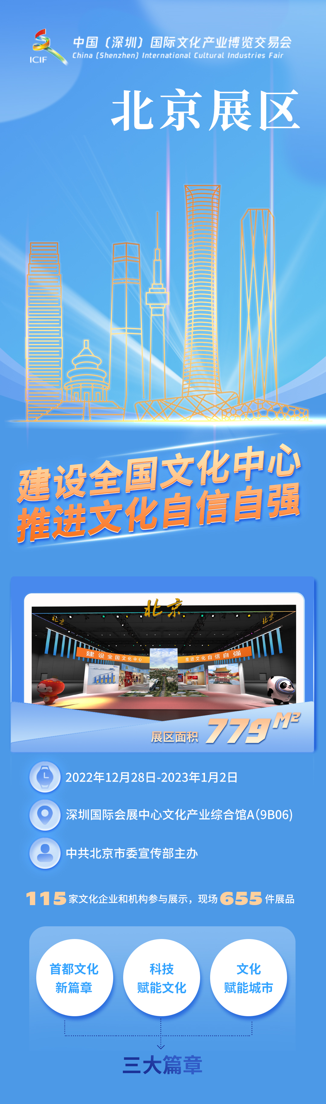 12月28日下午,第十八届中国(深圳)国际文化产业博览交易会开幕。由中共北京市委宣传部主办的北京展区,以“建设全国文化中心 推进文化自强自信”为主题,通过线上和线下形式汇聚115家文化企业和机构参与展示。现场655件展品见微知著,既展示了大国首都的文化之美、科技之力,也折射出首都文化建设的首善标准和精品意识,带来一场高端硬核又互动亲和的文化盛宴。