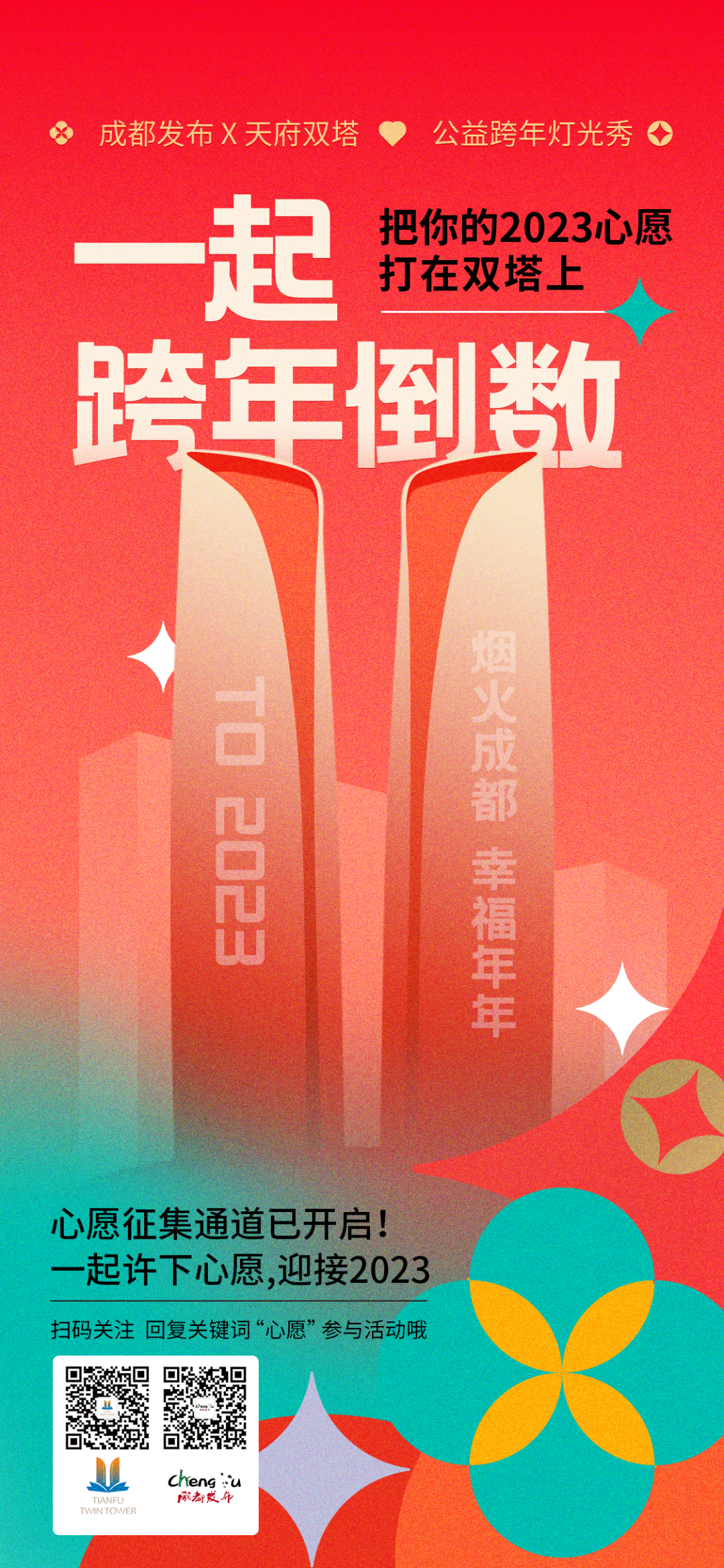 2022与2023交接的跨年夜,12月31日,成都发布将联合城市封面地标天府双塔的独家运营商——成都高新文创传媒有限公司,共同打造一场公益跨年灯光秀——“TO 2023:烟火成都 幸福年年”,我们邀请你——或许你是来自各行各业的成都人,或许你只是惊鸿一瞥的游客,一起跨年倒数,一起许下新年心愿,迎接2023。