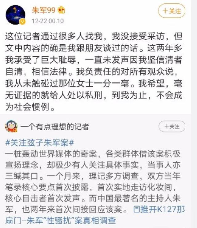 据悉,2018年,一名到电视台实习的女生“弦子”发文控诉,称在工作期间于化妆室遭到朱军“隔着衣服试图猥亵”,幸亏当时阎维文进入化妆室,才得以脱身。此消息流出后引起轰动,彼时朱军可是家喻户晓的央视一哥。朱军第一时间发律师声明否认,指责女方所说的性骚扰内容不实,已向法院提起诉讼。两人的官司从2018年开打到2022年,法院今年8月宣布二审结果,维持一审判决认定女方提交的证据不足,驳回原告的诉讼请求。至此,这场历时四年的风波,以女方败诉收尾。