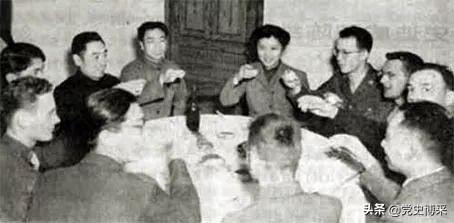 ◆抗战期间,美国陆军军官与中共中央代表(顺时针方向起)王炳南、乔冠华、周恩来、肖显法、龚澎在重庆八路军办事处宴会上相互敬酒。