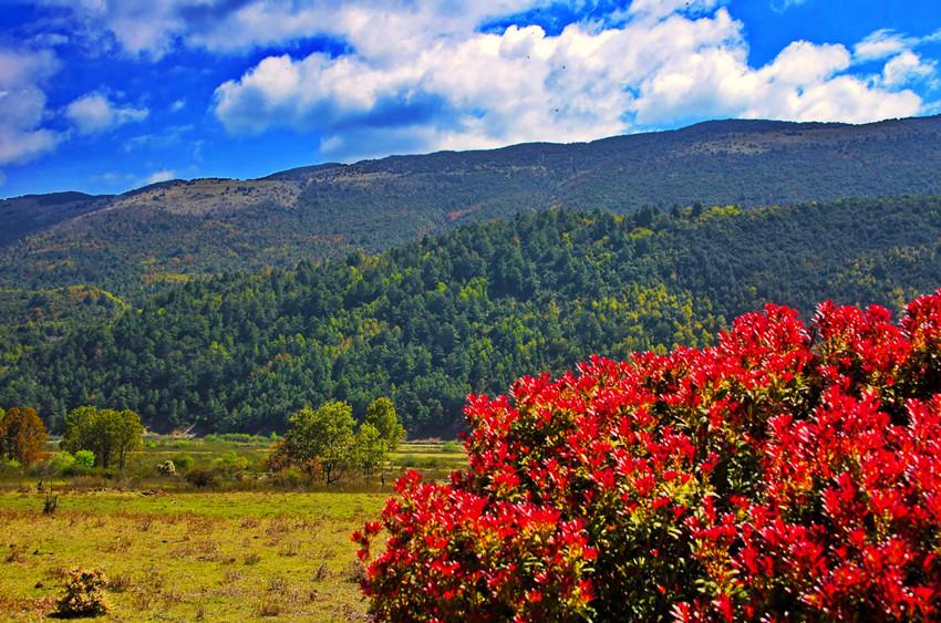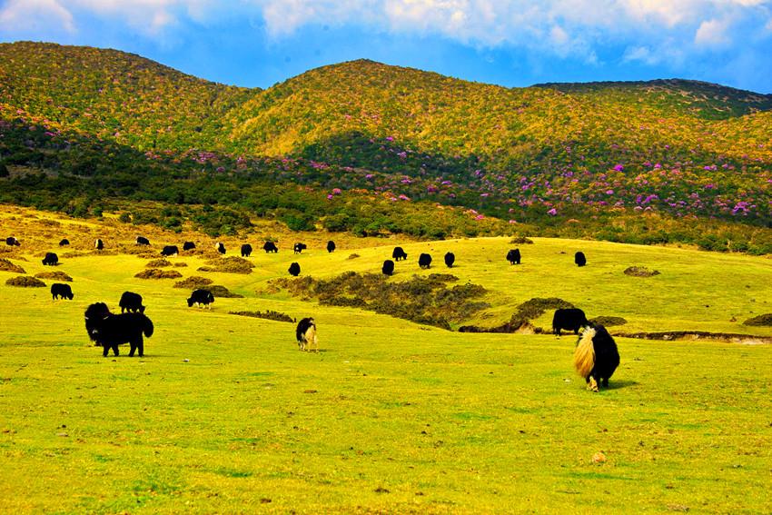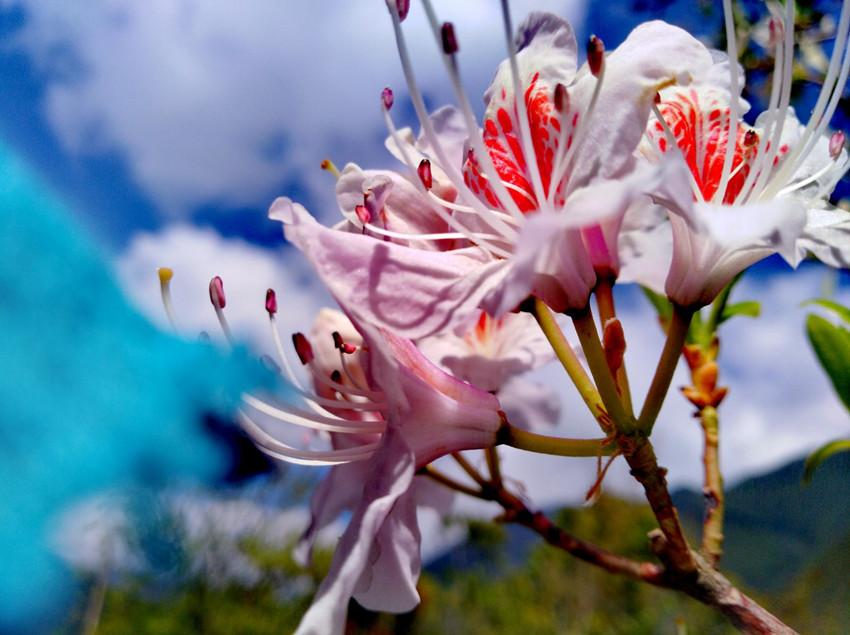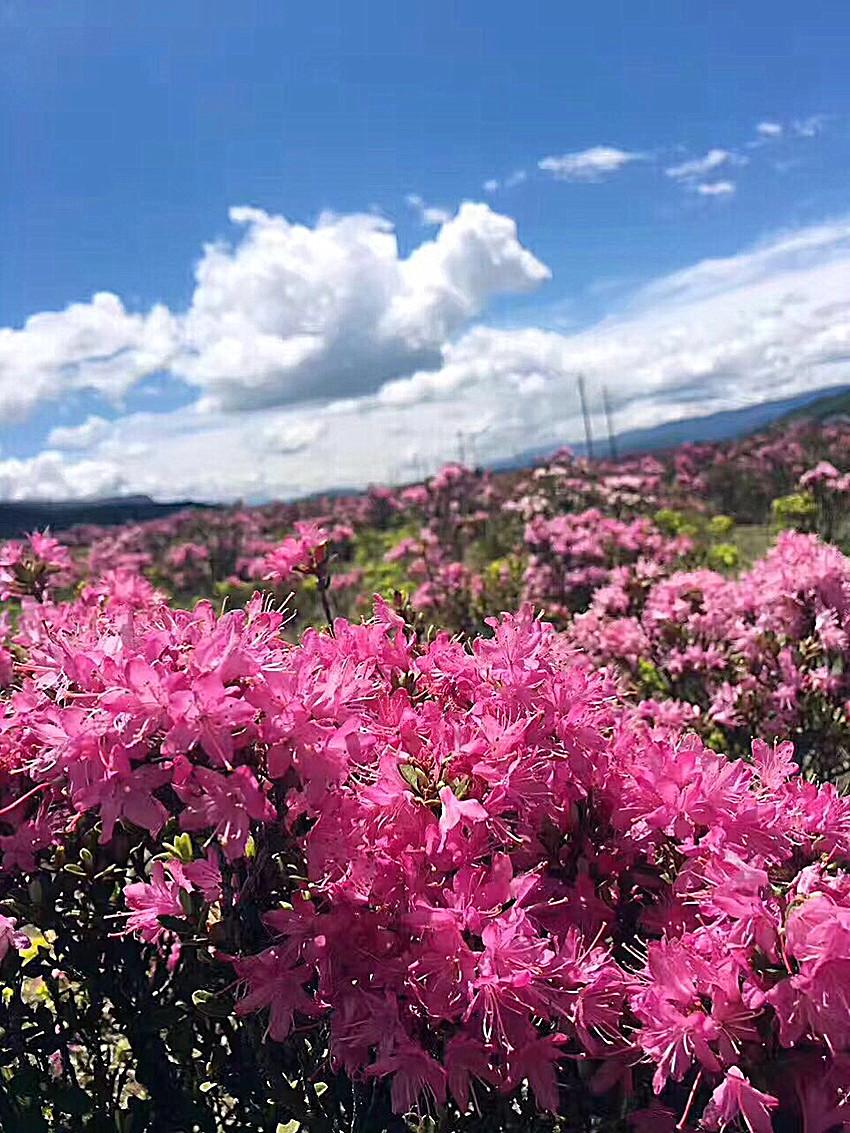 只顾贪恋于这身边的美景,竟然忘记了花甸坝的花儿,直到一位远处的同伙向我呼喊,并依稀看到远远山坡上红绿交织的色调时,才明白她是提醒我别只顾草原风光,而忘记了来这里的初衷。当下雀跃着一路飞奔,来到芳香扑鼻,绚丽妖娆的高山杜鹃前……