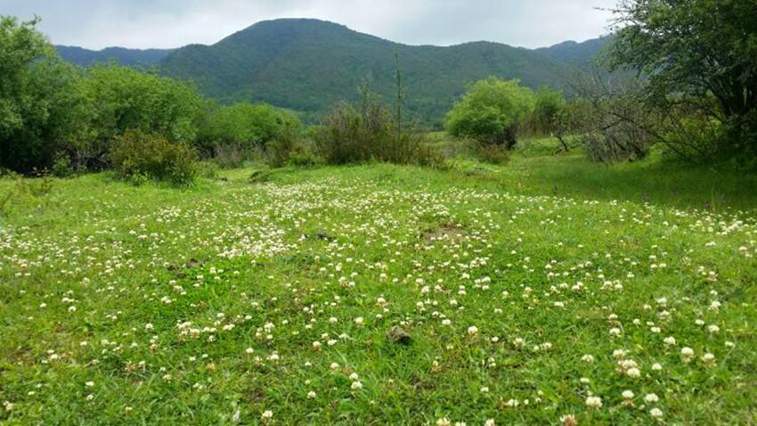 花甸坝分为大小两个花甸,两者之间的海拔由2900米一直攀升至3200米,步行大约需要两个多小时,由于高海拔的特殊地势,使得这里时常呈现出典型的高原蓝样貌,加之降水充沛,在山峰汇集成溪水顺流而下,将这片绿地滋润的更加秀美葱郁。