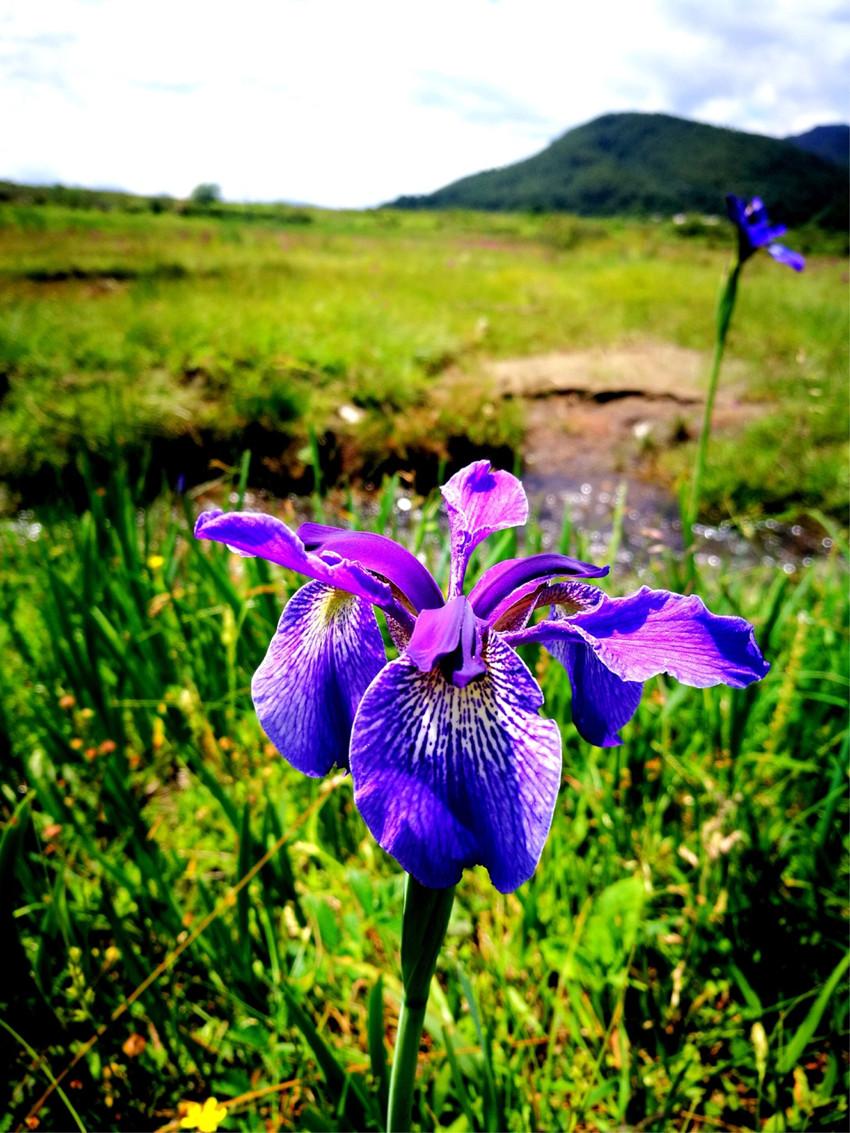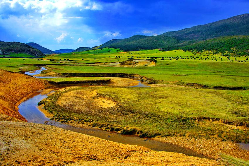 一条清澈而绵长的溪流,温婉地回旋于草甸之中,象是一条优雅轻盈的丝带将眼前的花甸坝装扮得如同一位精致又惊艳的少女。