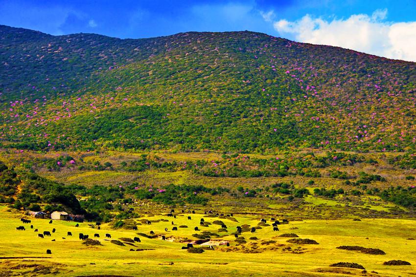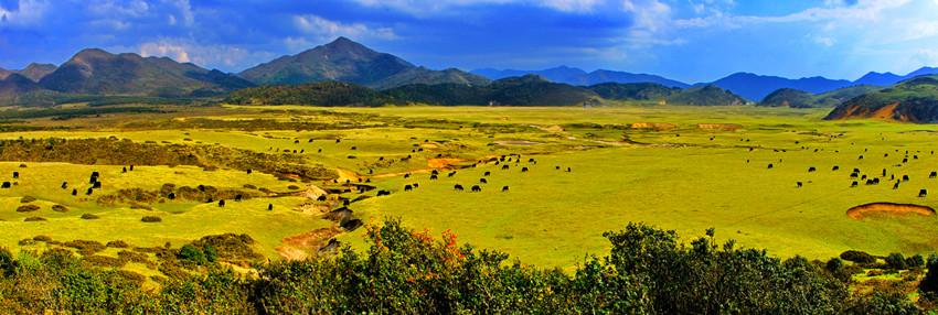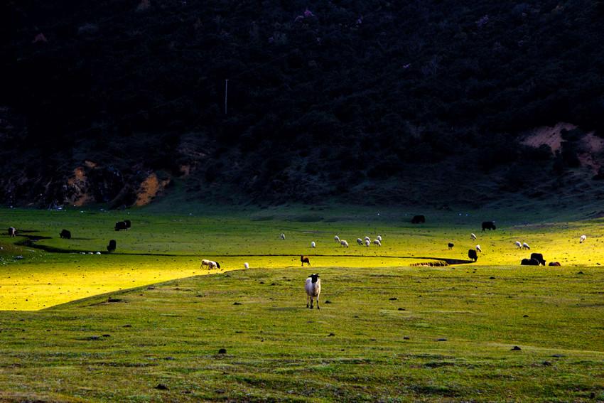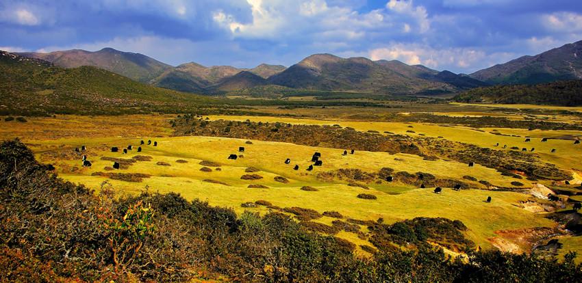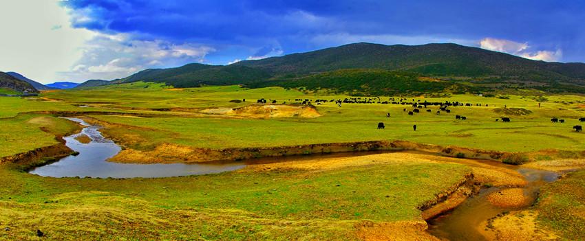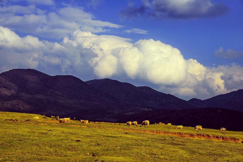 金色的原野中,散落着一只只的牛马羊,这样的画卷,在我的记忆中,始终认为只有在新疆或内蒙才可以看到,却不曾想这遥远的南国也能领略到如此广袤的草原美景。