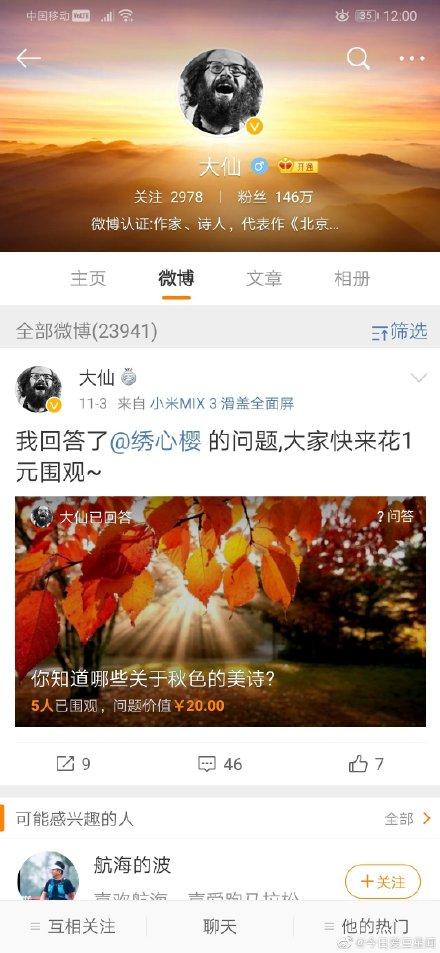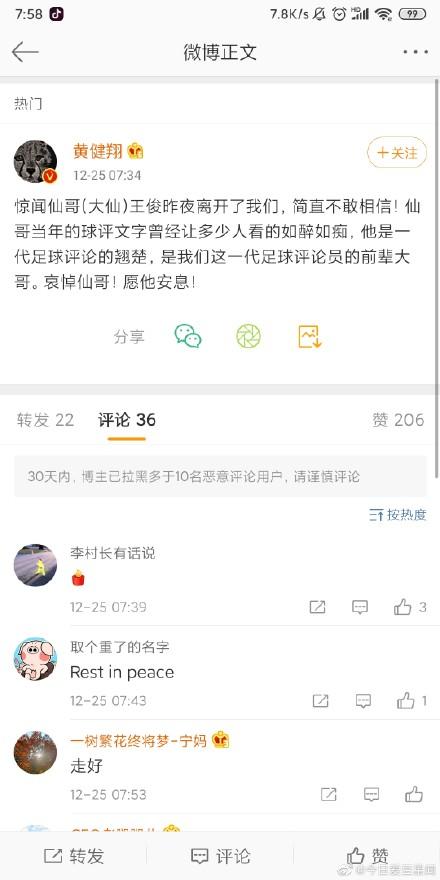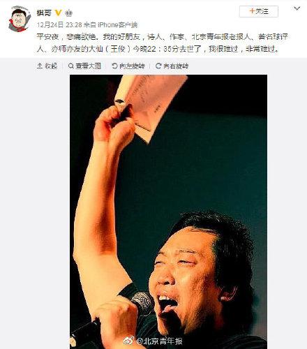 12月24日22:35分,北京作家、诗人、著名球评人大仙(王俊)因病去世,享年60岁。多位微博大V发博悼念。