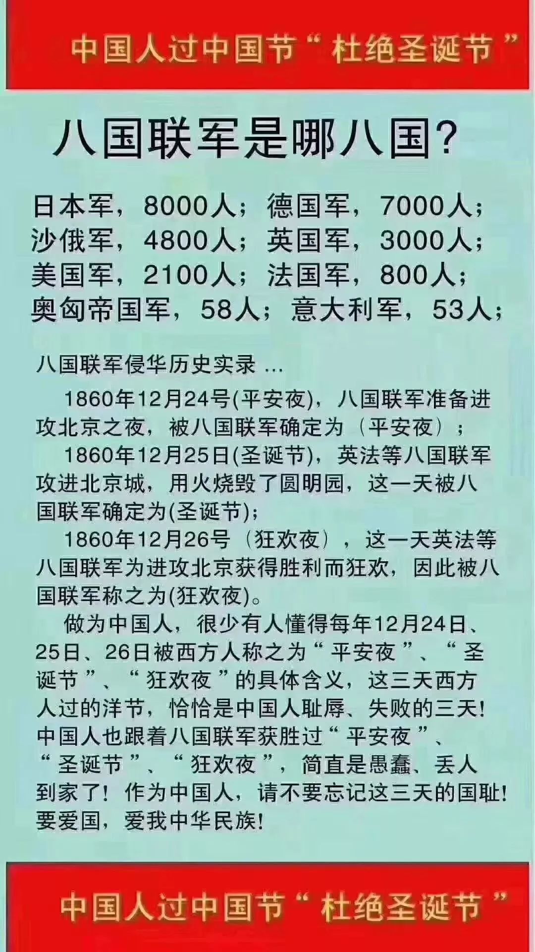 图片的主要内容是:平安夜、圣诞节和狂欢夜,起源于一百多年前的八国联军火烧圆明园,中国人如果过这些节日简直就是中国人的耻辱……