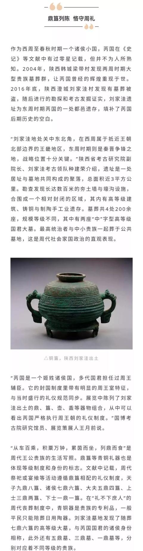 不同等级贵族所使用礼器的数量、组合的差异性,反映出当时社会对彰显和维护等级制度的重视和强化。一些青铜重器的铭文中还留有与芮相关的记载,虽然寥寥数笔,但已经用不可磨灭的印迹实证了一段缺失的封国历史。