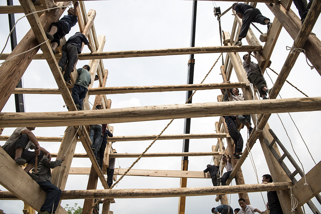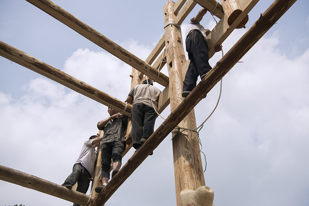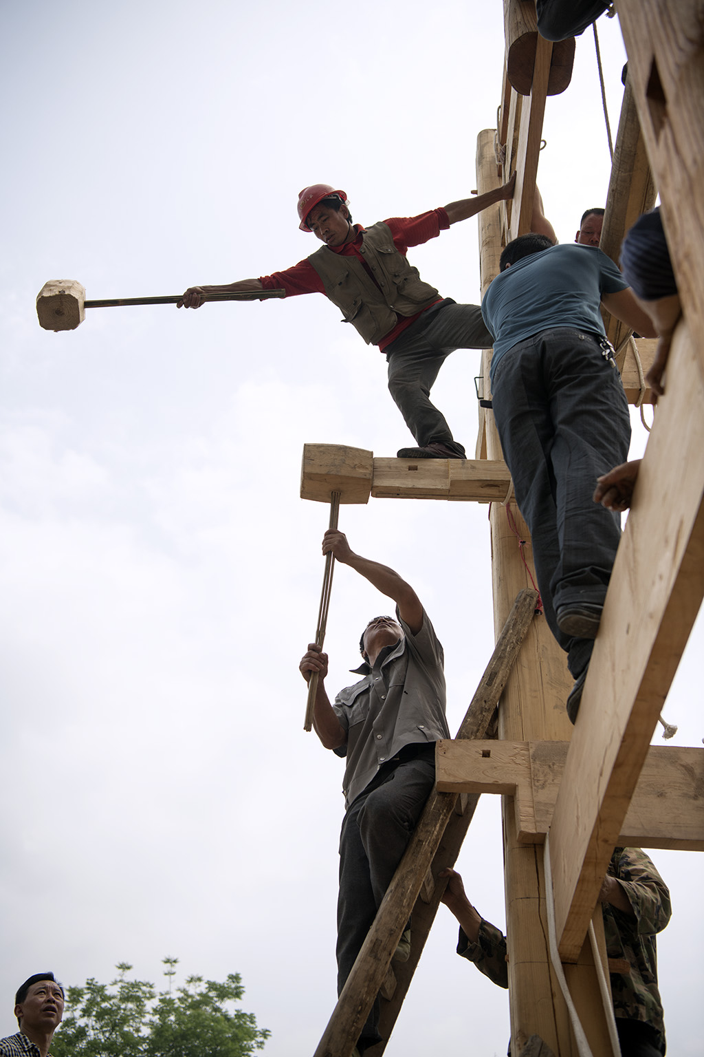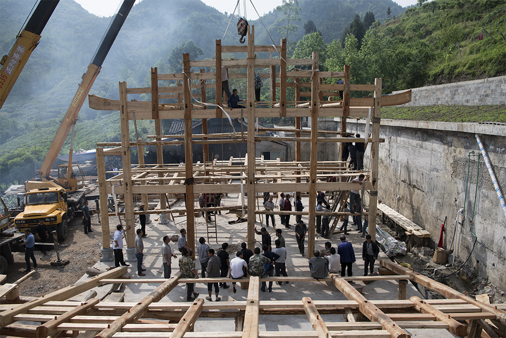 主体结构的各个部件经过一段时间的制作完成后,就开始组装,行话称为“排扇”,就是将加工好的柱头、穿枋组合成一个整体,然后选择黄道吉日把组装好的骨架立起来,称为立房子。