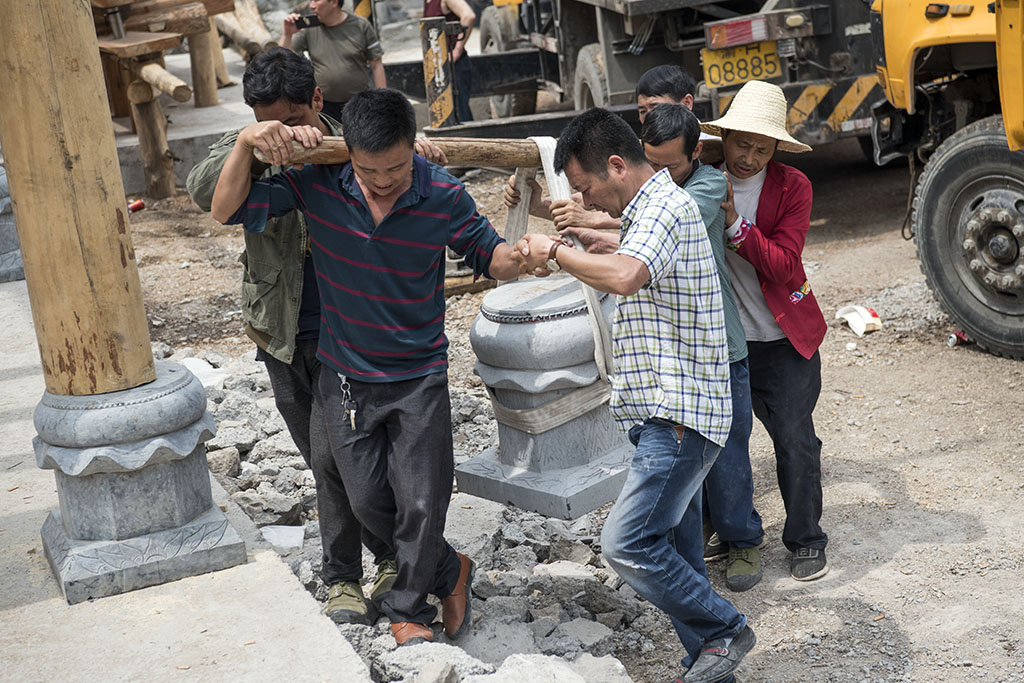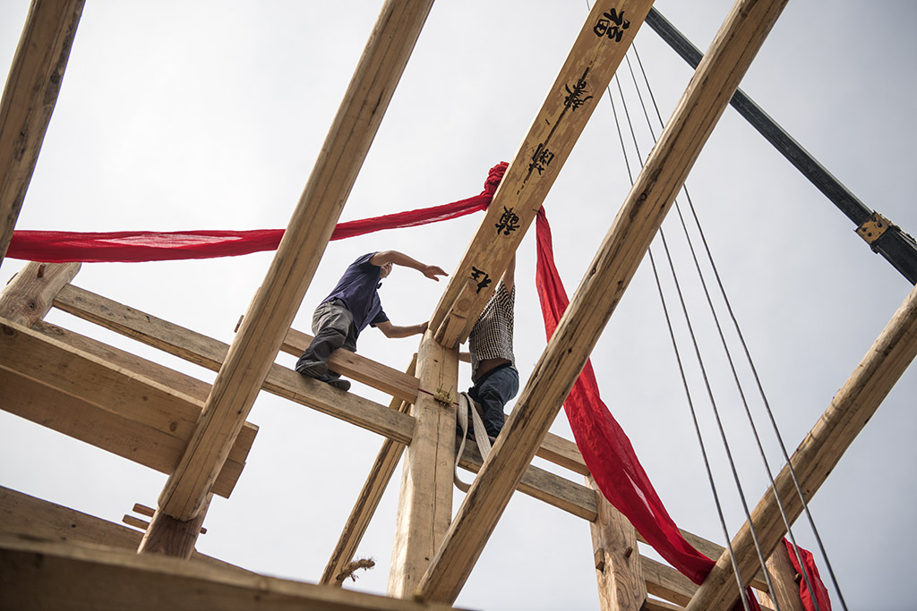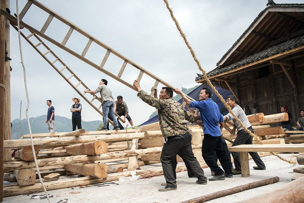 立房子的时候,掌墨师主持仪式、发号施令,霎时间,唢呐齐鸣、礼炮震天,帮忙的众人在掌墨师以及木工师傅的带领下,或推或拉,一起用力,让一扇扇的列子(骨架)依次站立起来。