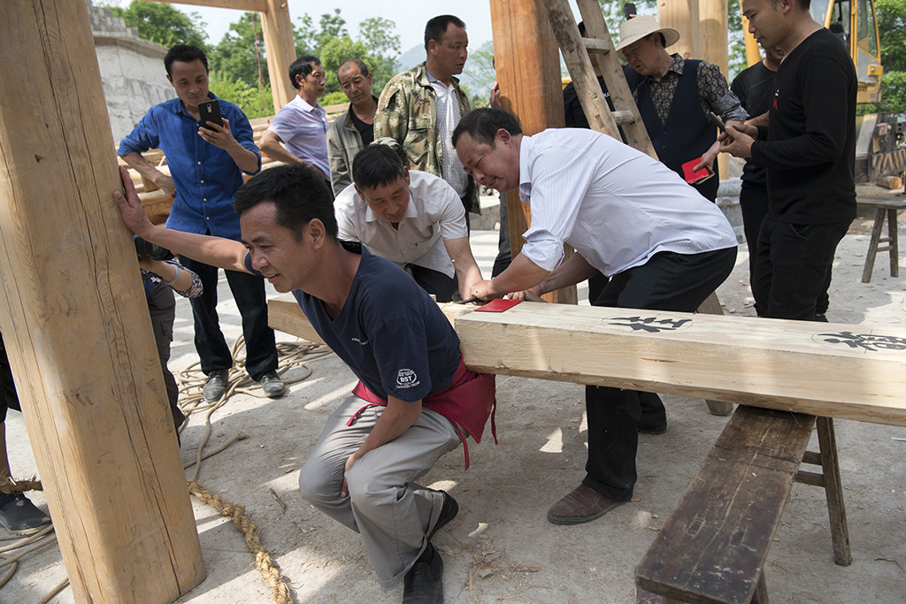 升梁的仪式很隆重,在礼炮和古乐声中,掌墨师指挥木匠师傅把大梁用绳子升到中柱的顶上,这时掌墨师念念有词:“木王木王,你生在何处,长在何旁?长在昆仑山上,长在凤凰山旁,莹莹露水赐它生,七彩阳光赐它长,主家砍回作栋梁,玉宇生辉大吉昌”。