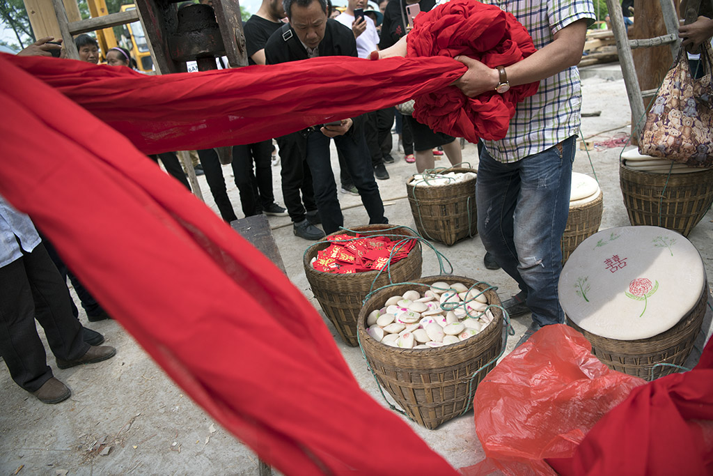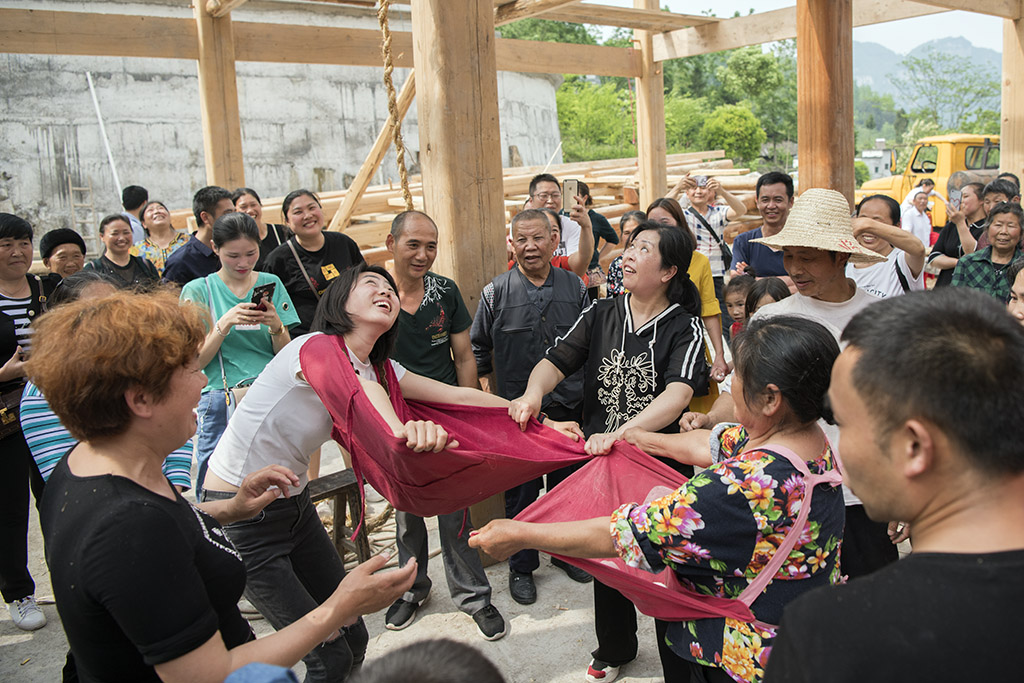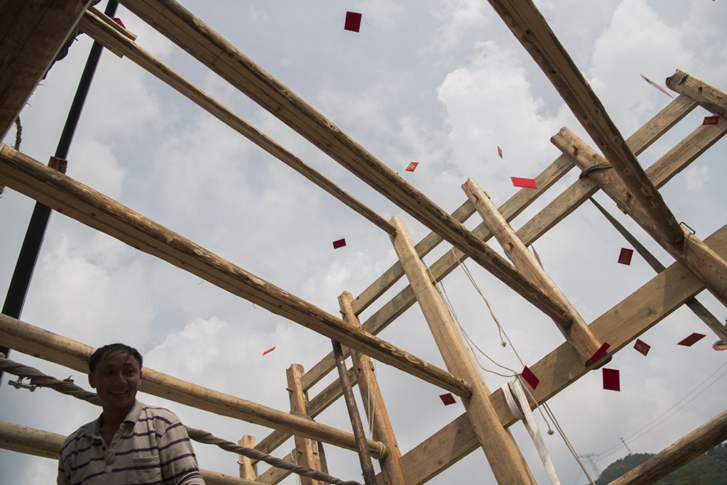 福事说完,掌墨师已经登上房梁,接着开始抛梁,把糍粑、米粑和红包抛向四方,有的落在头上,有的落在脚边,有些落在草丛中,有些落在田埂边。男女老少一起哄抢,讨个吉利,这时候,立房子的喜庆氛围达到了高潮。