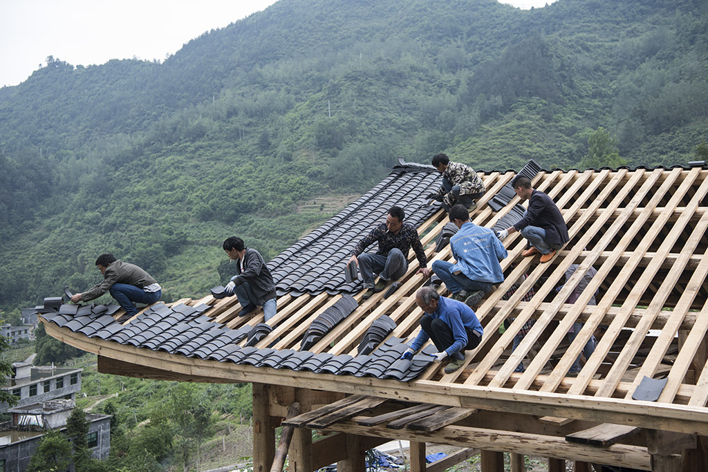 椽子钉好后,就由瓦匠师傅盖瓦,盖瓦也很有讲究,檐口的瓦要盖密一些,以增加重量,以免被山风揭起,脊梁上的瓦要造型,中间高、两头翘,就像两个马鞍的形状。高高的脊梁,不仅美观,而且很有气势。