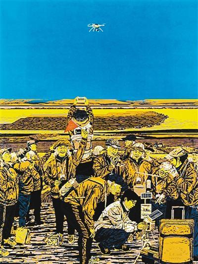 版画《金秋时代》中,北大荒早期开拓者组成的返乡参观团,正认真倾听新一代建设者讲述“数字化”的故事;宁静湛蓝的天空中,无人机正记录下集约化生产的场景。