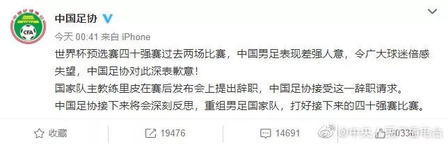 2019年11月,中国男足在世界杯预选赛中负于叙利亚队。赛后,中国足协通过微博为中国男足的糟糕表现向球迷致歉:“中国男足表现差强人意,令广大球迷倍感失望,中国足协对此深表歉意!”