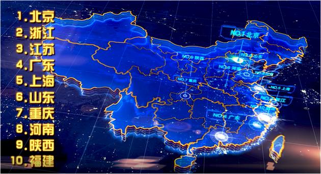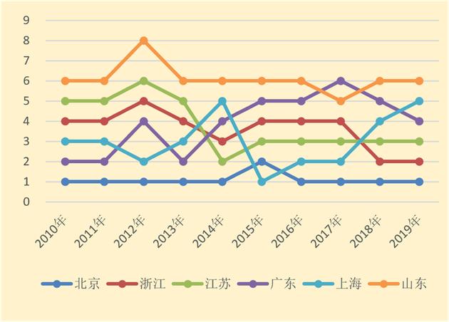 近十年均位居前十的省份包括北京、浙江、江苏、广东、上海和山东