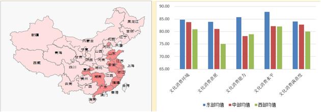 左图为2019文化消费指数前十名,右图为2019东中西部地区文化消费指数