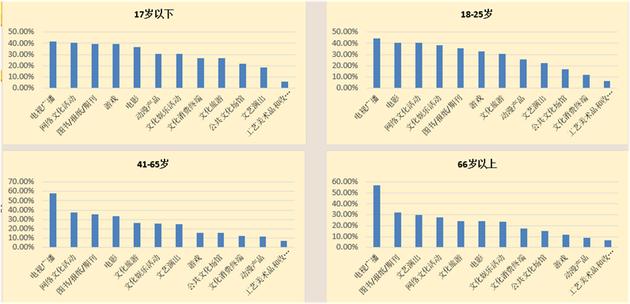 从各个年龄段的文化消费情况来说,25岁以下更青睐游戏、动漫、网络文化活动,40岁以上更偏爱的是文艺演出还有传统类的文化产品。特别值得一提的是,从近几年的数据可以看出,随着智能手机、网络电视的普及,40岁至65岁,以及65岁以上的中老年人对于网络文化活动的选择率持续提升。