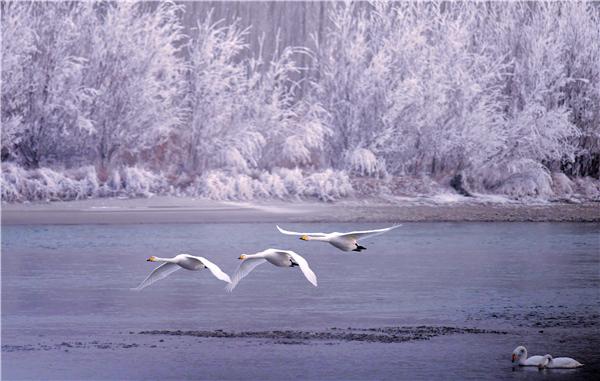 新疆维吾尔自治区和静县开都河湾终年不结冰,每年十二月,成群的天鹅从远方飞来。它们成群结队,或追逐戏水,或引吭高歌,或凌空翱翔,景象十分壮观。(新疆维吾尔自治区和静县纪委监委供 肖永浩 摄)