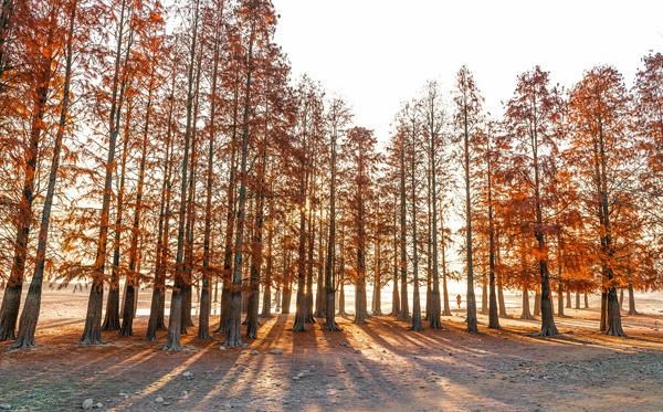 冬日清晨,初升的阳光洒向安徽省黟县奇墅湖畔一片池杉树林,把红色的树叶映照得通红透亮,置身其中,顿感暖意融融。(安徽省黟县纪委监委供 崔健 摄)