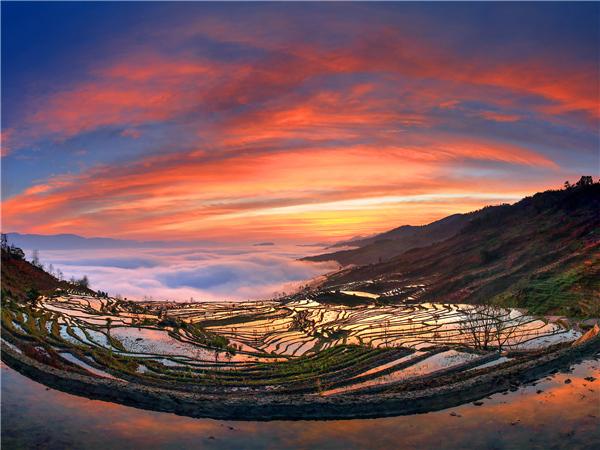 红河哈尼梯田位于云南省东南部,十二月陆续开始灌水。因当地气候变化,经常形成大片的云海,伴着日出日落时的霞光,景色异常美丽。(云南省昆明市纪委监委供 王会元 摄)