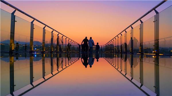 晚餐后,福建省沙县一家三口漫步沙溪河畔虬龙桥欣赏晚霞,大手牵小手,温馨美好。(福建省沙县纪委监委供 程诺 摄)