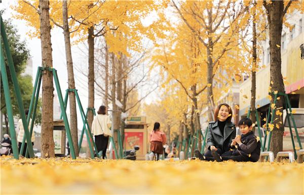 十二月是江南银杏最美的时节。随风而下的落叶为浙江省台州市市府大道铺上了一层厚厚的地毯,一对母子在树下玩耍其乐融融。(浙江省台州市椒江区纪委监委供 陈胡南 摄)