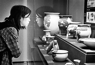 参观者在二里头夏都遗址博物馆内观看展出的陶器。新华社发