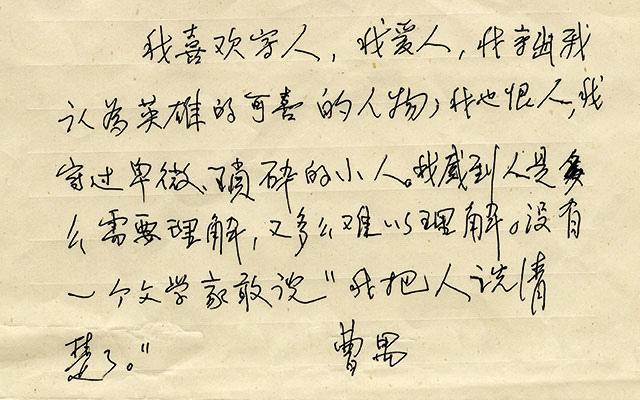 曹禺曾说:“我喜欢写人,我爱写人,我写出我认为英雄的可喜的人,我也恨人,我写过卑微、琐碎的小人。我感到人是多么需要理解,又多么难以理解。”直至晚年,他仍喜欢观察人。