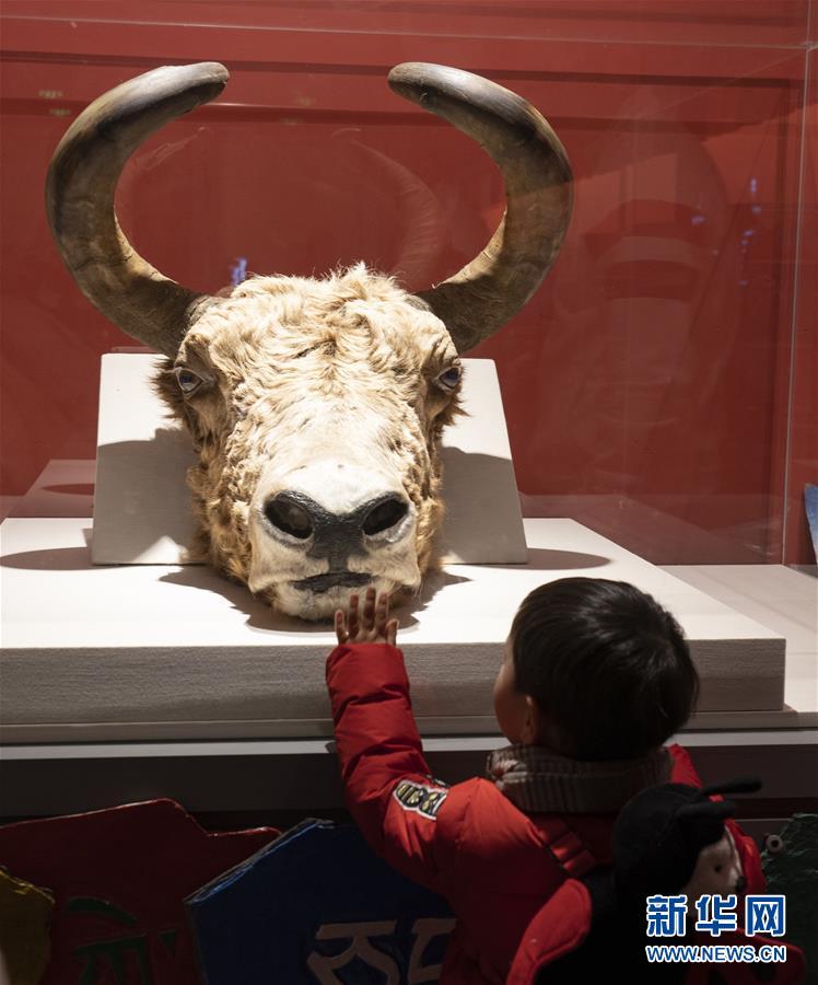 12月28日,一名小朋友在观赏牦牛头展品。新华社发(赵凡瑜 摄)