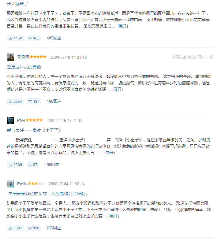 《小王子》不仅赢得了儿童读者,也为成年人所喜爱,作品凝练的语言渗透了作者对人类及人类文明深邃的思索。它所表现出的讽刺与幻想,真情与哲理,使之成为法国乃至世界上最为著名的一部童话小说。