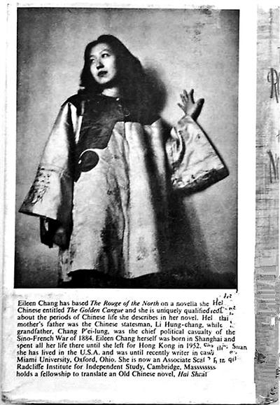 照片之下,是一段英文简介——首先介绍了张爱玲的家世背景,提及其外曾祖父李鸿章与祖父张佩纶,似乎是有意要强调此书作者乃中国清代重臣遗族的身份。应当说,这样的介绍,对照封底的照片,很容易让读者产生联想——祖籍河北丰润、生于上海的张爱玲,不正应了此书书名页之前印着的那一句“南朝金粉,北地胭脂”吗?