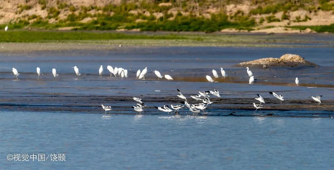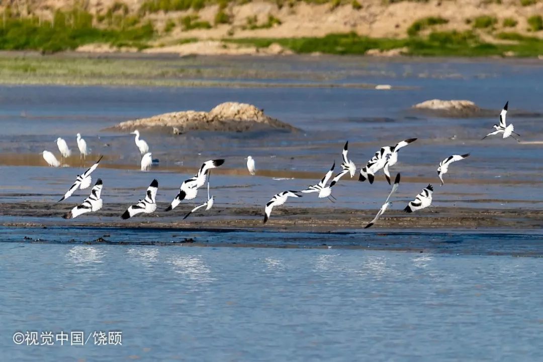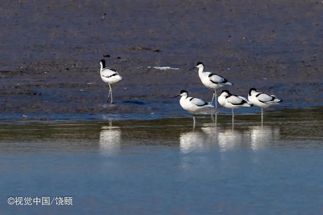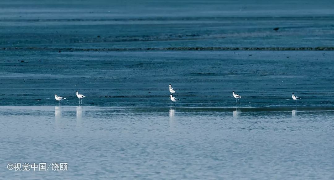 寒潮过后,暖阳重现,杏花村湿地闪着银光,当它们逐渐退却时,留下了一道道沉积的泥沙。早前裸露的湖床上,返青的苔草蔓延开大片绿色,让人不辨冬春。反嘴鹬成为这片松软泥沙地上的“常客”。