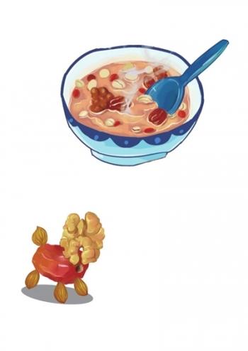 老福州的传统腊八粥,还有个有趣的特色,在粥上放只由几种果子做成的“小狮子”,取避邪之义。脆枣剔核烤干后做狮身,半个核桃仁做狮头,桃仁做狮脚,杏仁做狮子尾巴,然后用糖浆把各部分黏在一起,放在粥面上。如果碗面大,还可以摆双狮,取“避邪吉祥”之义。