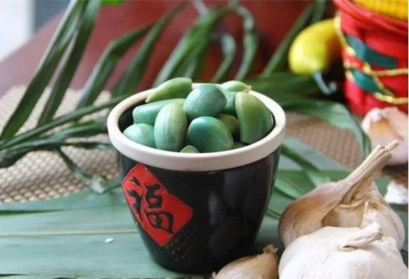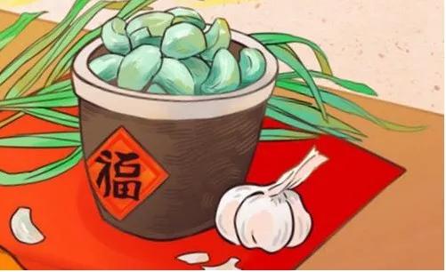 腊八这一天,家里长辈会找来小桌小椅,让小孩围坐下帮忙剥紫皮蒜。再找来小瓷坛、玻璃瓶,放进清水洗过的蒜,倒上米醋,然后封好口,放在较暖的地方。到除夕启瓶开封,醋变辣了,蒜也变成翡翠绿色,不但好看,而且好吃。饺子蘸醋,想着都馋人。