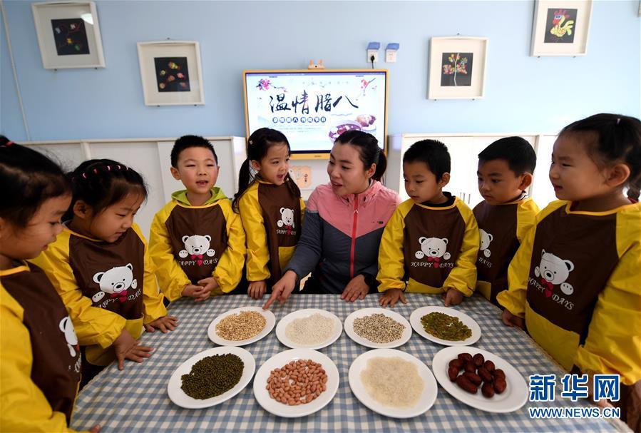 1月2日,在石家庄市第一幼儿园,老师教孩子们认识制作腊八粥的食材。 当日是腊八节,河北省石家庄市桥西区辖区幼儿园开展“传统节日民俗体验之旅”活动,小朋友们通过辨识腊八粥食材、腌制腊八蒜、绘制创意“粥画”等形式,感受传统文化魅力。 新华社记者 王晓 摄