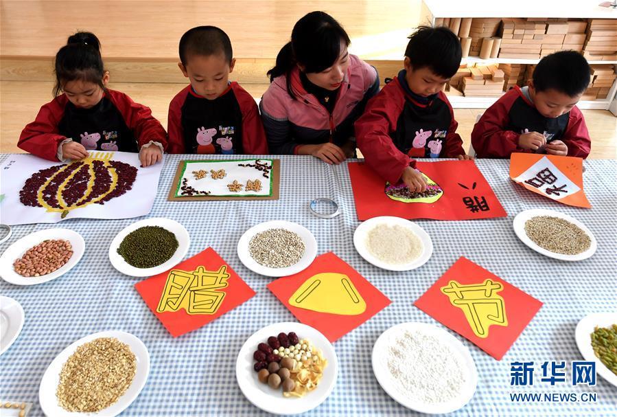 1月2日,在石家庄市第一幼儿园,老师指导孩子们制作创意“粥画”。 当日是腊八节,河北省石家庄市桥西区辖区幼儿园开展“传统节日民俗体验之旅”活动,小朋友们通过辨识腊八粥食材、腌制腊八蒜、绘制创意“粥画”等形式,感受传统文化魅力。 新华社记者 王晓 摄
