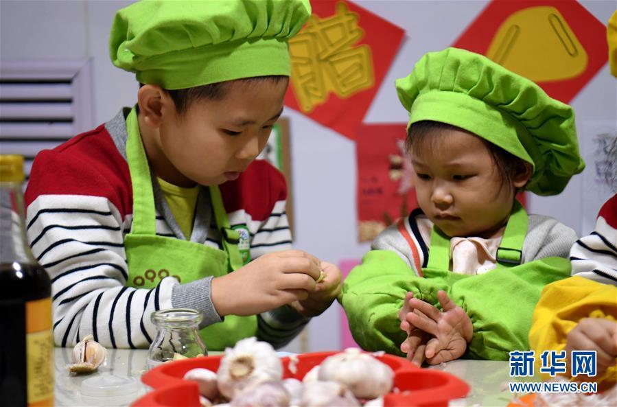 1月2日,在石家庄市第一幼儿园,小朋友在制作腊八蒜。 当日是腊八节,河北省石家庄市桥西区辖区幼儿园开展“传统节日民俗体验之旅”活动,小朋友们通过辨识腊八粥食材、腌制腊八蒜、绘制创意“粥画”等形式,感受传统文化魅力。 新华社记者 王晓 摄