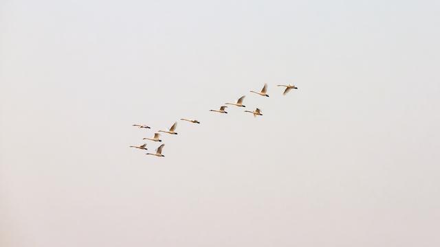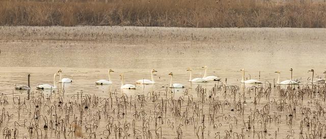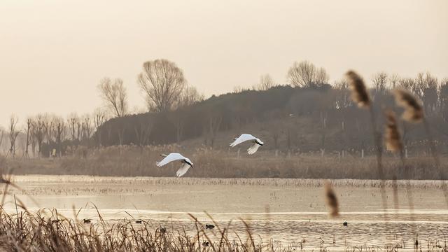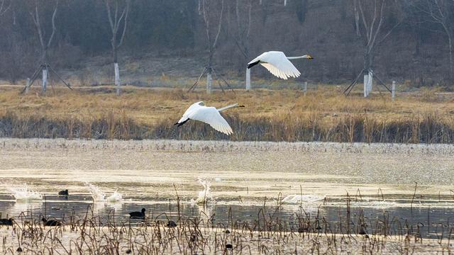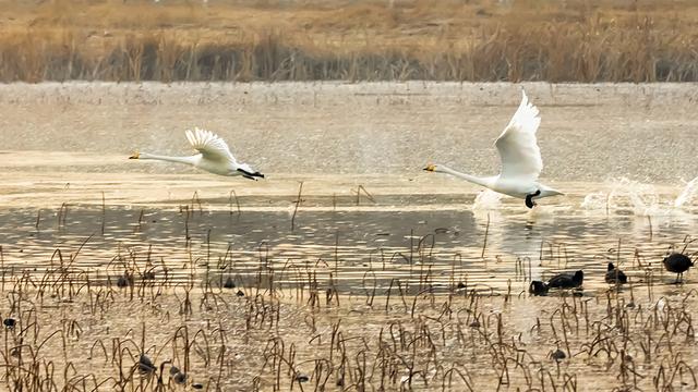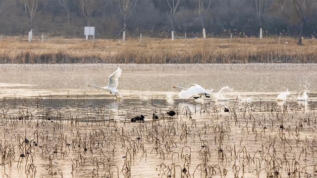 深冬时节,在济南黄河岸边的龙湖湿地看到,暖阳下一群白天鹅在湖中悠然游动,忽而引颈歌吟,忽而翩翩起舞,忽而振翅而起,在天空中优美地飞翔。再看湿地,成群结队的野鸭、野孔雀在水中或岸上嬉戏,与芦苇、残荷构成一幅“天鹅湖”别致的画卷,呈现出王勃《滕王阁序》中“鹤汀凫渚,穷岛屿之萦回”的景致。 白天鹅是一种候鸟,主要生活在多芦苇的湖泊、水库和池塘中。栖息于西伯利亚的白天鹅为了避寒,在气候转冷之际,迁徙至我国山东、河南以及南方各地越冬,等到来年春暖花开时返回故乡。 自2002年以来,每年秋冬会有一些南迁的天鹅,在济南鹊山龙湖水域停留过冬,不曾间断。白天鹅对气候环境要求比较高,它们栖息龙湖,说明这里的环境越来越好,适宜天鹅越冬。(大众日报客户端记者 杨润勤 摄影 张宝贤 )